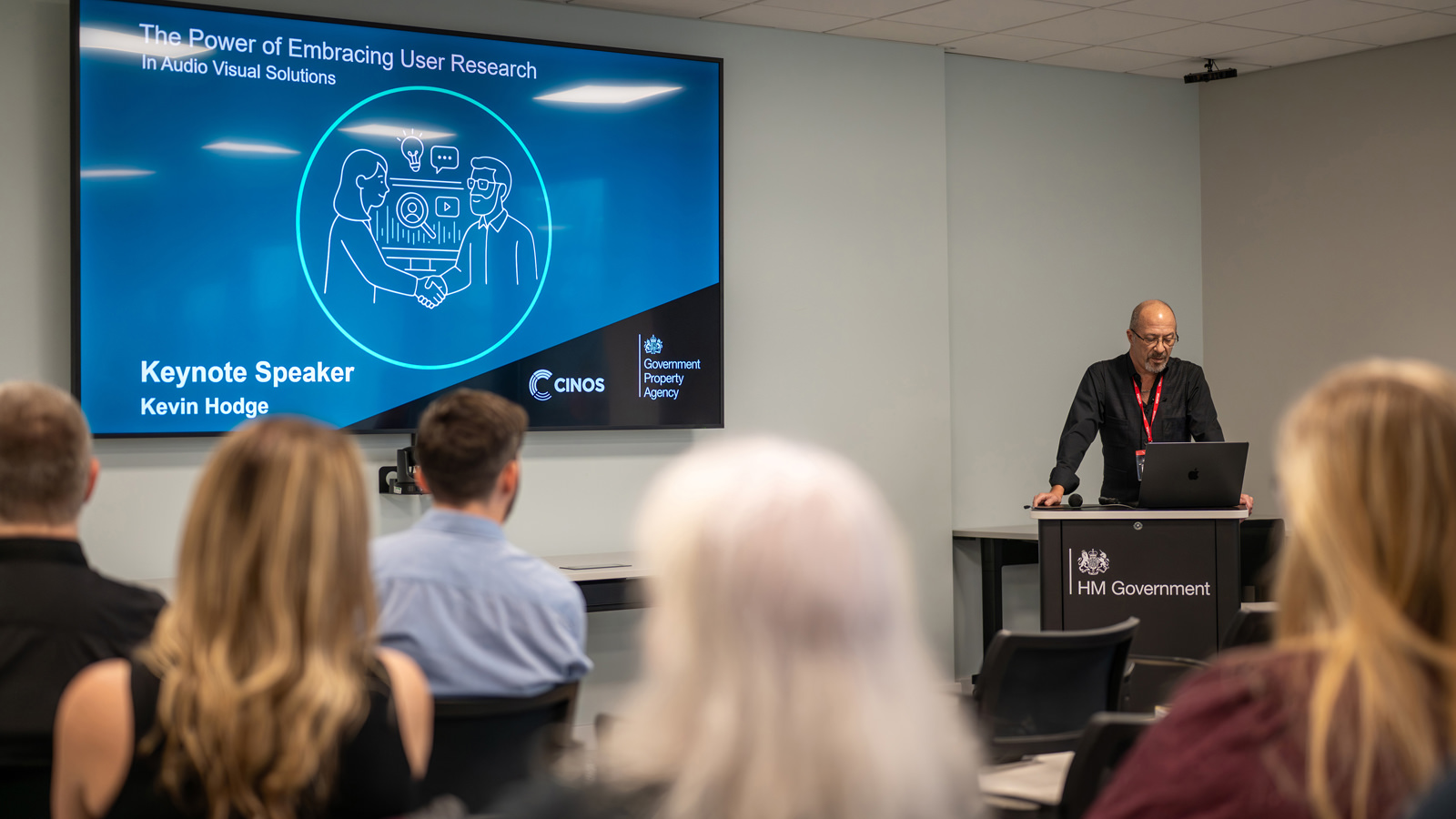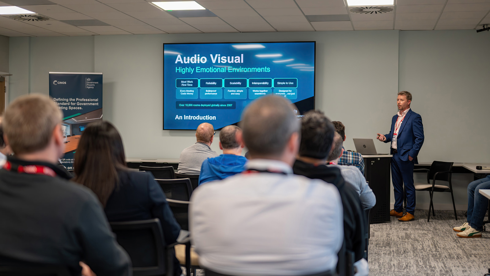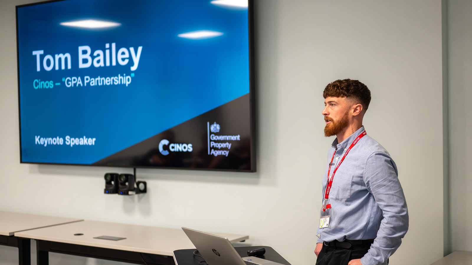 Introductions from Ed Wiliamson of the GPA and Karl Deady from Cinos provided context for the day and set the tone for the sessions ahead. Cinos’ Tom Bailey outlined the journey of the partnership, from its beginnings in 2020 to its formal establishment in 2022 when Cinos were recognised as the GPA’s strategic AV partner. He went on to explain the joint development and rollout of AV Standards Version 3, a meeting room solution built on principles of simplicity, interoperability, and sustainability, with deployment set to reach over 600 government meeting rooms by April 2026.